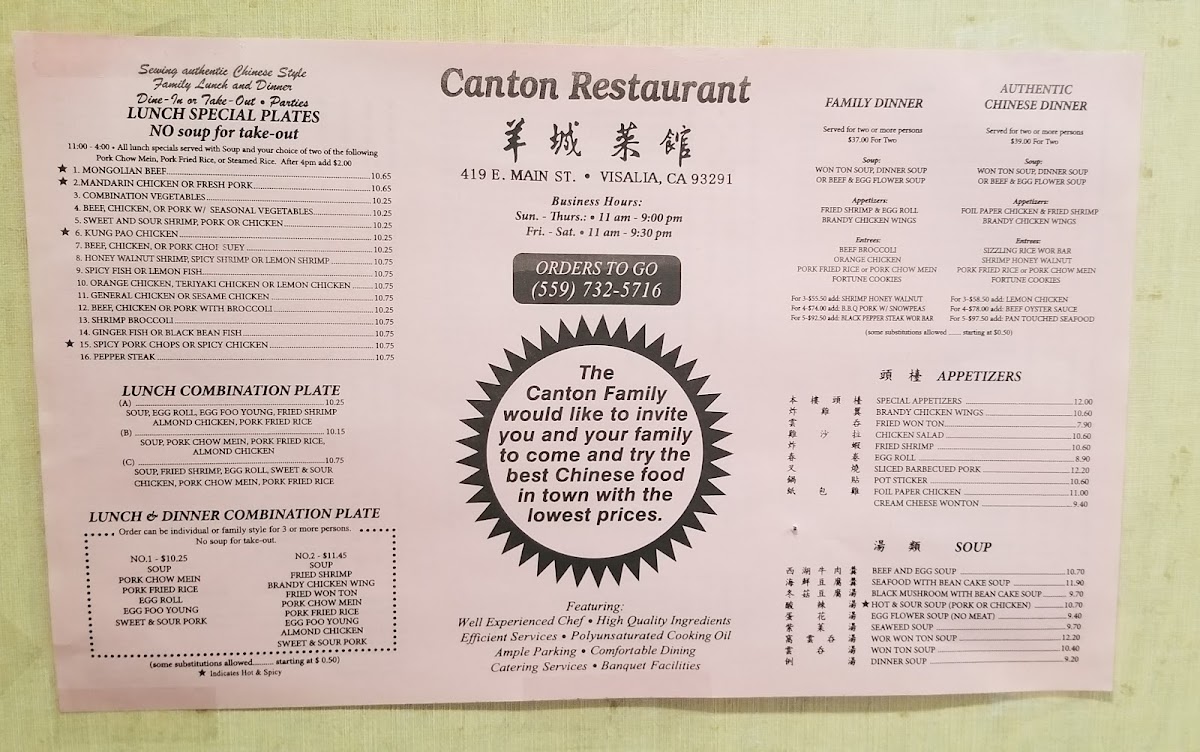 Welcome to Canton Chinese Restaurant, a beloved gem located at 419 E Main St, Visalia, CA. Known for its warm ambiance and elegant décor, this restaurant has become a cherished spot for families over the years.